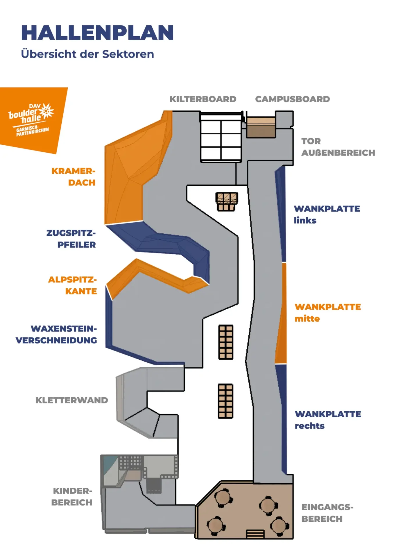 Unsere Boulderhalle bietet Dir auf 600m² Boulderrouten in 6 verschiedenen Schwierigkeiten und ein Kilterboard. mit fast 400 m² Boulderfläche